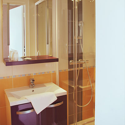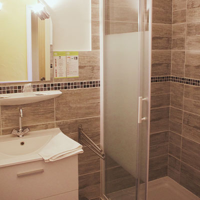 AMENAGEMENT PMR : Deux chambres ont été spécialement aménagées pour s'adapter aux besoins de nos clients à mobilité réduite. Elles ont été conçues afin de laisser suffisamment d'espace pour pouvoir accéder au lit, à la salle de bain équipée d'une douche à l'italienne et aux toilettes en fauteuil roulant.